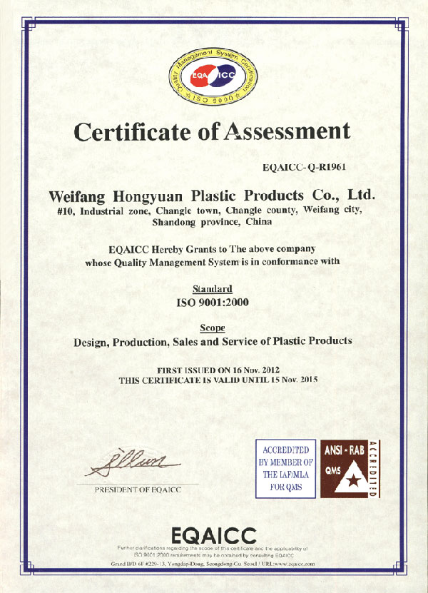 潍坊宏源塑料制品有限公司享有进出口权。产品直接出口到欧洲、北美、澳大利亚等十多个国家和地区。公司的座右铭是“质量和信...